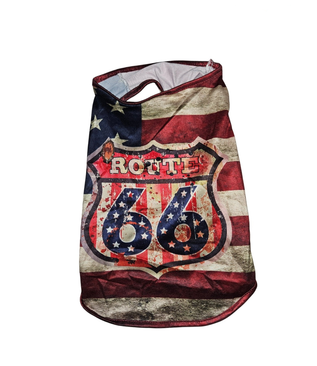 "This stylish pet shirt showcases a vintage-inspired Route 66 design with an American flag background, perfect for adventurous pets with a patriotic flair."