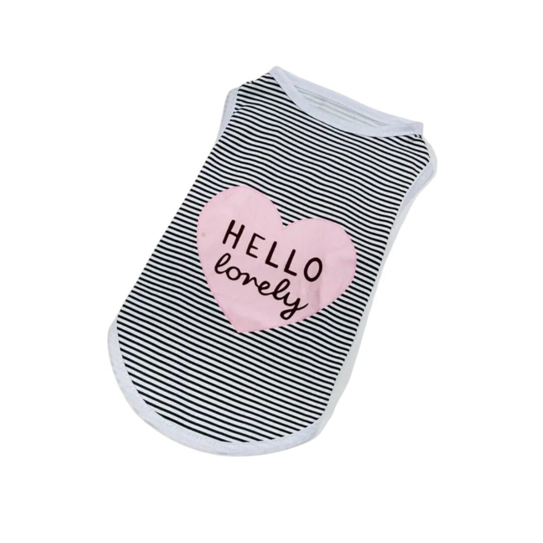 This is a stylish pet shirt featuring black and white horizontal stripes with a huge pink heart in the center. The heart has the phrase "Hello Lovely" printed on it, making it a cute and charming outfit for small pets.